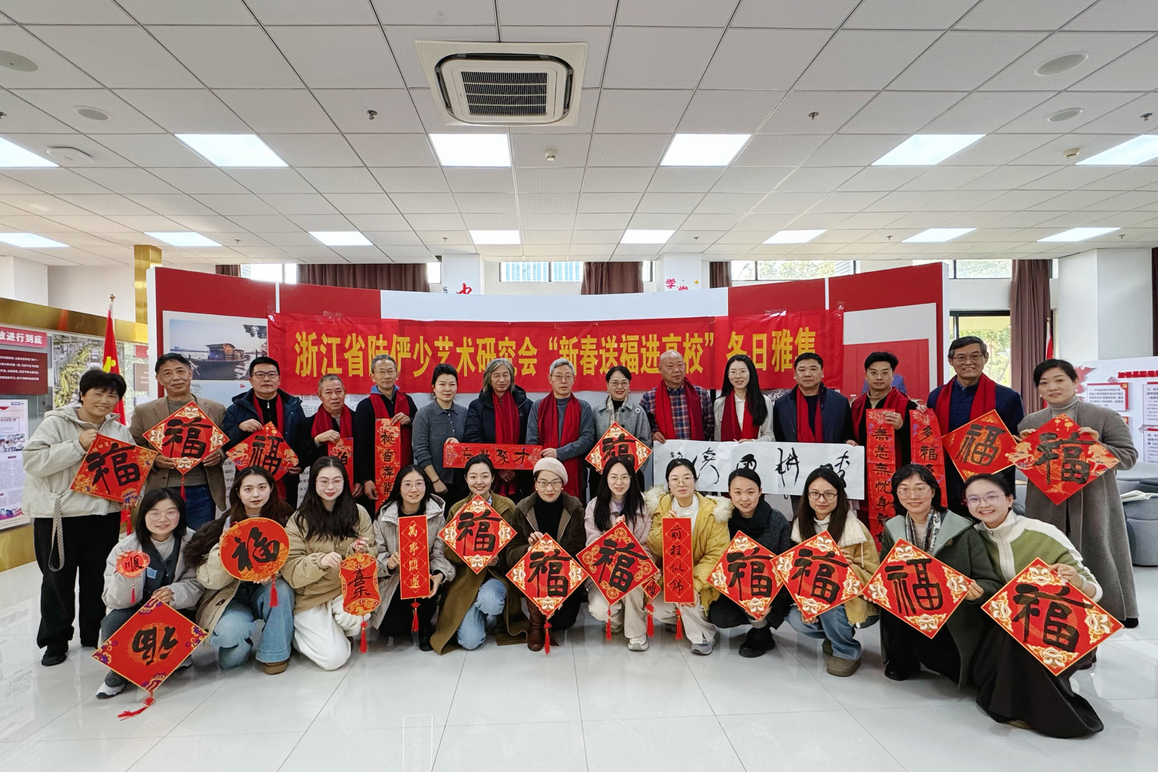 笔墨含香添雅韵,春联载福贺新春。1月12日上午,“迎新春、送万福、进万家”书法公益活动在格致楼一楼党员之家顺利开展,本次活动由浙江省教育工会指导,浙江省教育书画协会组织,杭州电子科技大学工会主办,信息工程学院分工会与信息工程学院研创中心承办。浙江画院办公室主任、浙江陆俨少艺术研究会副会长兼秘书长余昌梅等一行11位浙江陆俨少艺术研究会书法家莅临现场,临安区文联党组书记、文联主席徐冠玉等临安区相关部门领导也出席共贺。学院党委书记王艳对各位书法家及嘉宾的到来表示热烈欢迎。